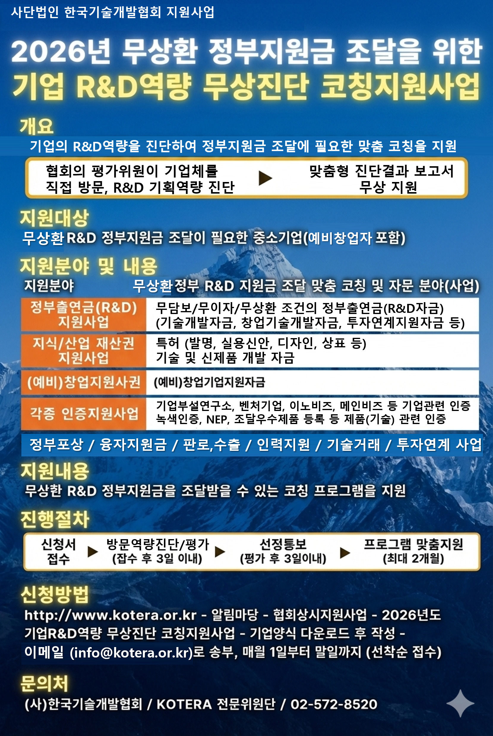 | » | 한국기술개발협회, 2026년도 무상환 정부지원금 조달을 위한 기업R&D역량 무상진단 코칭지원사업 공고 | 한국기술개발협 | 2025.12.15 | 23 |