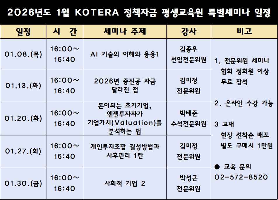 1월 KOTERA 정책자금 평생교육원 특별강좌는, 'AI 기술의 이해와 응용1', '2026년 중진공 자금 달라진 점', '돈이되는 초기기업', '엔젤투자자가 기업가치(Valuation)를 분석하는 법', '개인투자조합 결성방법과 사후관리 1탄', '사회적기업 2 ' 등 다양한 주제로 진행된다.
