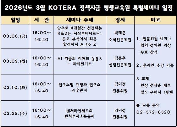 국내 최대 정책자금 커뮤니티 정실미 다음카페를 공식 후원하고 있는 비영리민간단체(NPO) 한국기술개발협회(협회장 최노아)는 협회 부설 KOTERA 정책자금 평생교육원의 2026년도 3월 정책자금 관련 특별 세미나 일정을 홈페이지를 통해 공지했다. 3월 6일(금)부터 25일(수)까지 다양한 주제로 특별 세미나 및 강의가 연일 진행된다.