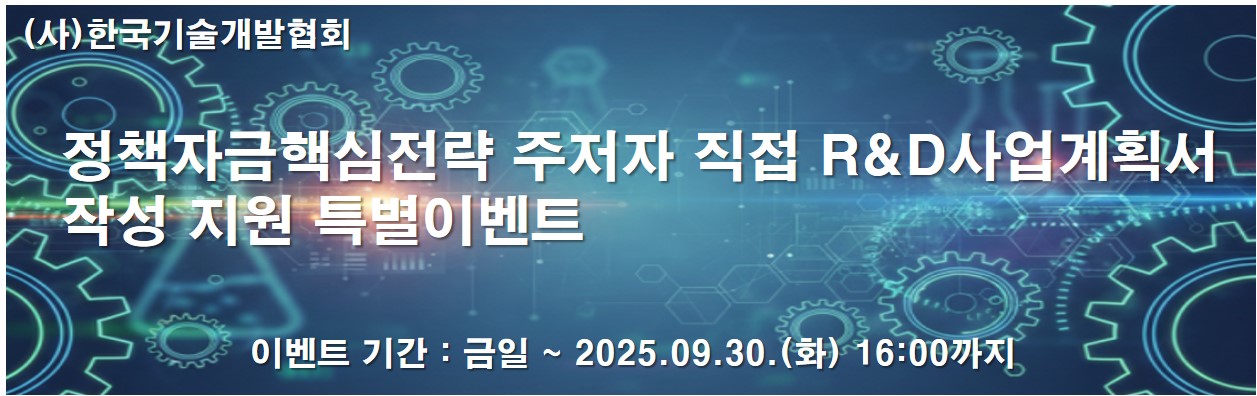 | » | 한국기술개발협회, 2026년 R&D 예산 확대 맞아 'R&D 과제 사업계획서 작성' 특별 지원 이벤트 진행 | 한국기술개발협 | 2025.09.21 | 5356 |
