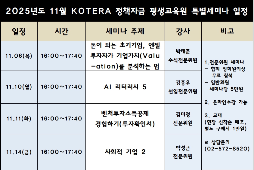11월 KOTERA 정책자금 평생교육원 특별강좌는, '돈이 되는 초기기업, 엔젤투자자가 기업가치(Valuation)를 분석하는 법, 'AI 리터러시 5', '벤처투자소득공제 경험하기(투자확인서)', '사회적기업 2' 등 다양한 주제로 진행된다.