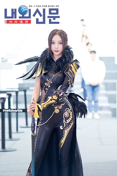 넷마블 부스의 모델 정은혜가 포즈를 취하고 있다.