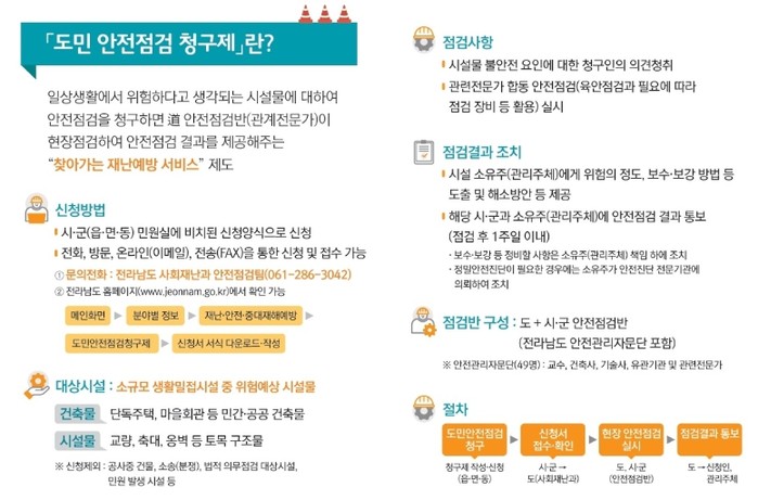 신청은 전남도 사회재난과 안전점검팀으로 전화, 팩스 또는 방문 접수하거나 전남도 누리집을 통해 온라인 접수할 수 있다.