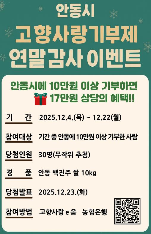 [파이낸셜경제=김지훈 기자] 안동시는 연말정산 시즌을 맞아, 고향사랑기부제 참여자에게 감사의 뜻을 전하고 기부 문화를 확산하기 위해 12월 22일(월)까지 ‘안동시 고향사랑기부제 연말 감사 이벤트’를 진행한다고 밝혔다.