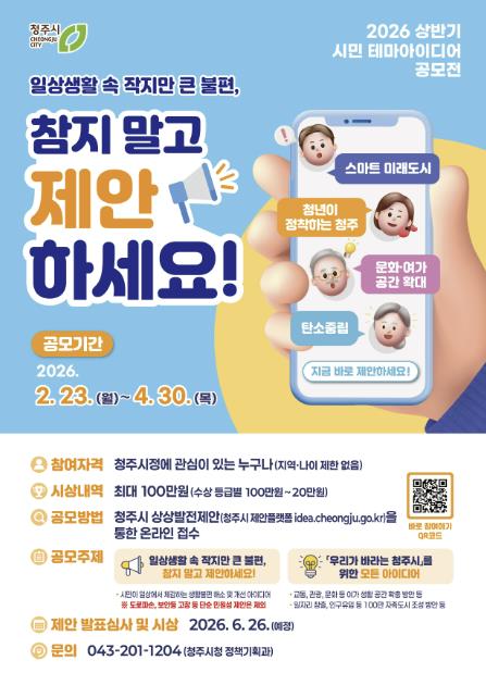 [파이낸셜경제=김기보 기자] 청주시는 시민의 창의적인 아이디어를 시정에 반영하기 위해 2월 23일부터 4월 30일까지 ‘2026년 상반기 시민 테마아이디어 공모전’을 개최한다.