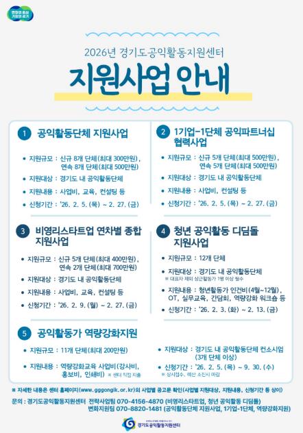 모든 사업은 경기도 내 공익활동단체 및 관련 주체를 대상으로 하며, 사업별 세부 모집 요강과 신청 방법은 경기도공익활동지원센터 누리집에서 확인할 수 있다.