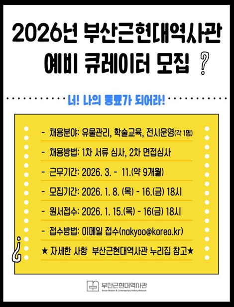 [파이낸셜경제=박영진 기자] 부산근현대역사관은 박물관 학예 분야 전문인력 양성과 청년 일자리 창출을 위해 오늘(8일)부터 1월 16일까지 '2026년 부산근현대역사관 예비 큐레이터(기간제근로자)'를 공개 모집한다고 밝혔다.