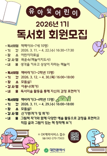 [파이낸셜경제=김영란 기자] 동대전도서관은 2026년 유아 및 어린이독서회(1기) 회원을 모집한다.