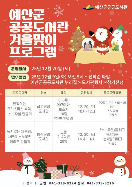 [파이낸셜경제=김영란 기자] 예산군 공공도서관은 겨울철을 맞아 오는 12월 20일 어린이와 가족이 함께 참여할 수 있는 ‘겨울맞이 크리스마스 체험 프로그램’을 운영한다.