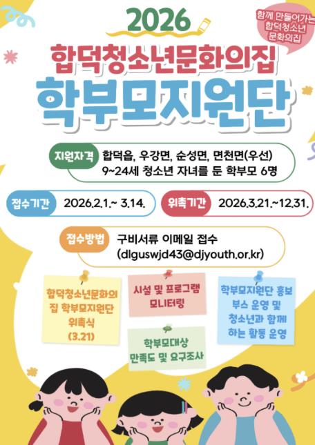[파이낸셜경제=김영란 기자] (재)당진시청소년재단 합덕청소년문화의집에서는 3월 14일까지 당진시 거주 청소년(9세~24세) 자녀를 둔 학부모 6명을 대상으로 2026년 합덕청소년문화의집 학부모 지원단을 모집할 예정이다.(단, 합덕읍, 우강면, 순성면, 면천면 거주 학부모 우선 순위)
