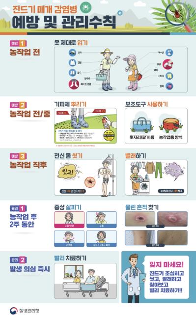진드기 매개 감염병을 예방하기 위해서는 △야외활동 시 피부 노출 최소화 △진드기 기피제 사용 △풀숲 피하기 △귀가 후 진드기 물림 여부 확인 및 옷 세탁 △2주 내 발열 등 증상 발생 시 의료기관 방문 등의 수칙을 지켜야 한다.