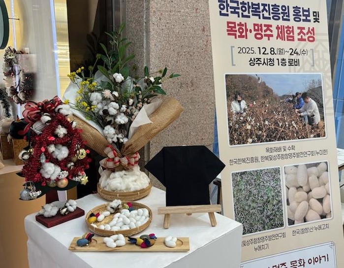 [파이낸셜경제=김지훈 기자] 한국한복진흥원 입주기업 누미한은 12월 8일부터 12월 24일까지 진흥원 내 목화밭에서 재배한 목화솜과 명주천을 활용한 체험형 전시를 상주시청 로비에서 진행한다.