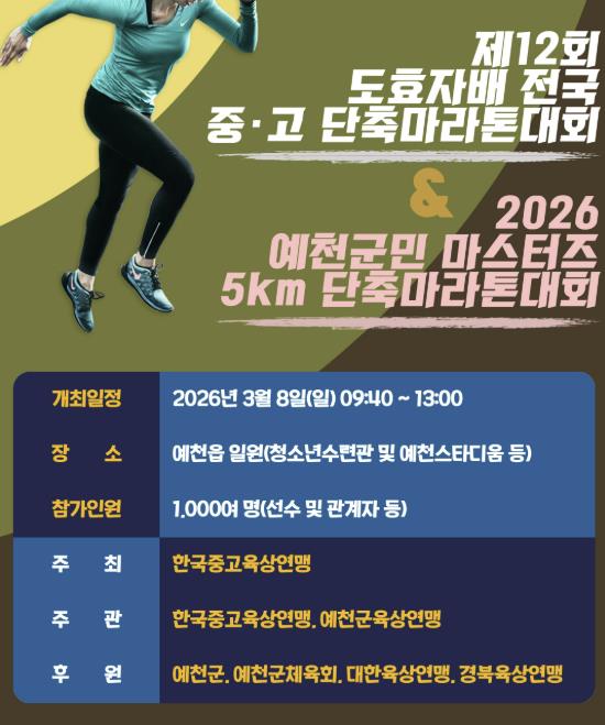 [파이낸셜경제=김지훈 기자] 예천군은 오는 8일 오전 10시부터 예천읍 일원에서 '제12회 예천 도효자배 전국 중·고 단축마라톤대회' 및 '2026 예천군민 마스터즈 단축마라톤대회'를 개최한다고 밝혔다.