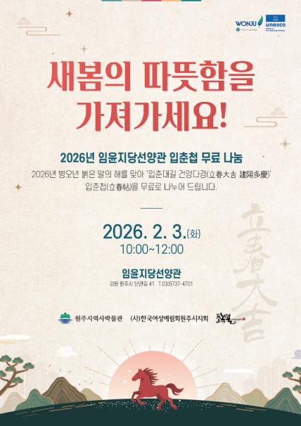 선양관 관계자는 “병오년, 붉은 말의 해를 맞아 지역 주민들의 가정에 건강과 안녕을 기원하는 마음을 담아 행사를 준비했다”라며, “많은 시민께서 방문하셔서 입춘첩을 받아 가시길 바란다”라고 말했다.