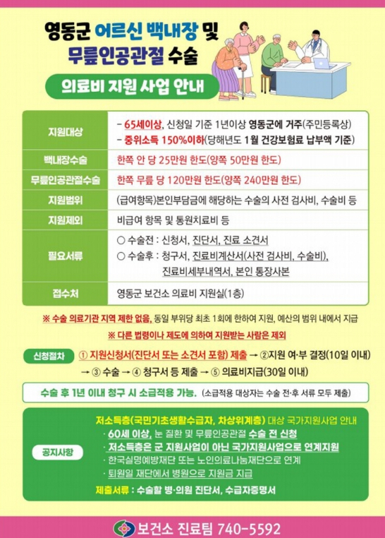 접수는 영동군보건소 1층 진료팀 의료비지원실에서 가능하며, 수술 의료기관은 지역 제한 없이 이용할 수 있다.