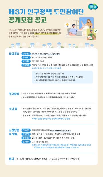 [파이낸셜경제=김영란 기자] 경기도가 정책 대상자가 직접 정책개선에 참여하는 ‘제3기 인구정책 도민참여단’ 100명을 공개 모집한다.