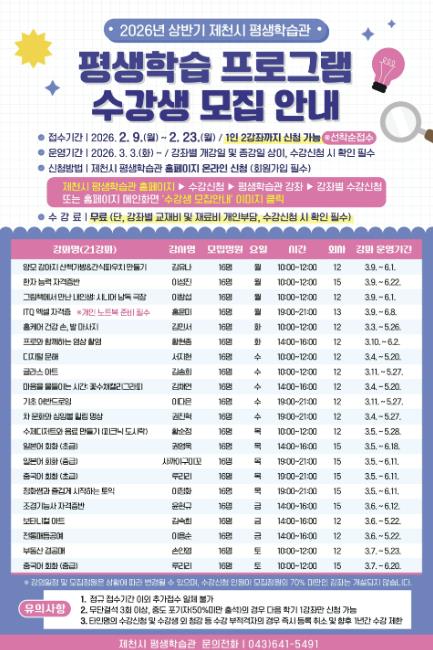 [파이낸셜경제=김기보 기자] 제천시가 2월 23일까지 2026년 상반기 평생학습관 프로그램 수강생을 모집한다.