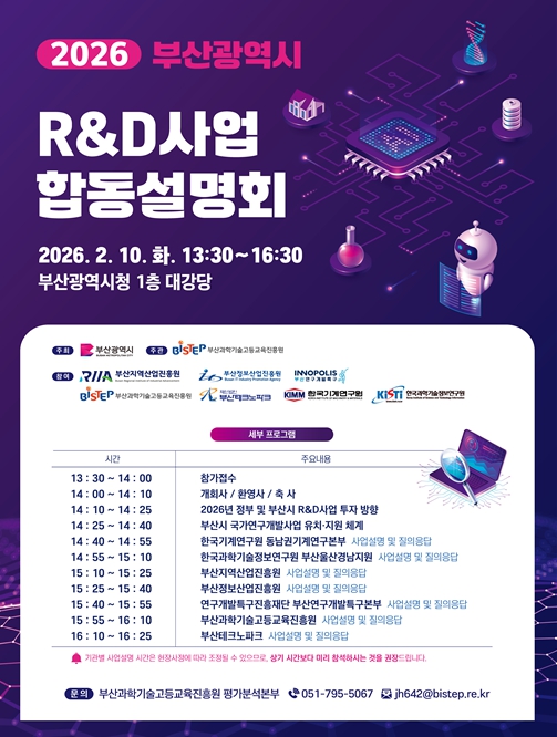 특히 이번 설명회에서는 2026년 정부 주요 부처별 연구개발(R·D) 지원사업 현황이 수록된 자료집을 현장에서 배포하며, 행사 종료 후에는 부산과학기술정보서비스(BTIS) 누리집을 통해 관련 자료를 내려받을 수 있다.