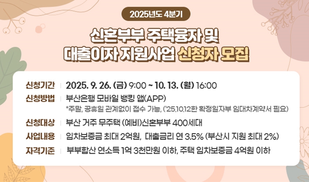 [파이낸셜경제=박영진 기자] 부산시는 올해 4분기 '신혼부부 주택융자 및 대출이자 지원사업'의 지원 대상자를 내일(26일)부터 10월 13일까지 모집한다고 밝혔다.