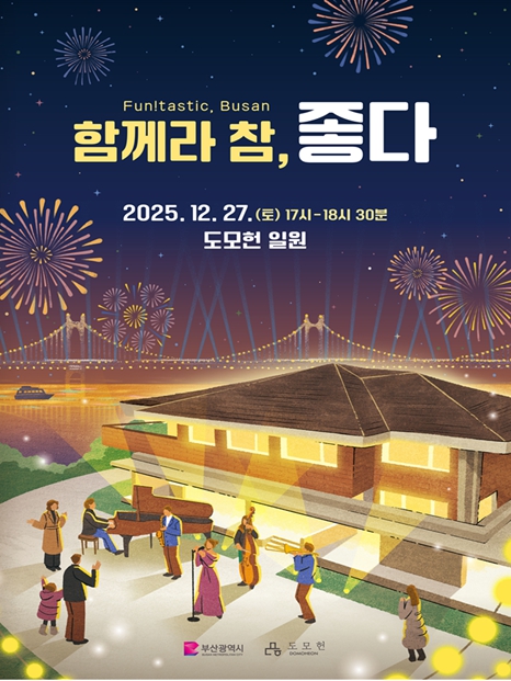 [파이낸셜경제=박영진 기자] 부산시는 오는 12월 27일 오후 4시 30분, 시민을 위한 열린 복합문화공간 도모헌(구 시장관사) 다할 강연장에서 시민 누구나 함께 즐길 수 있는 연말 콘서트 '함께라 참, 좋다 펀!타스틱 부산(Fun!tastic Busan)'을 개최한다고 밝혔다.
