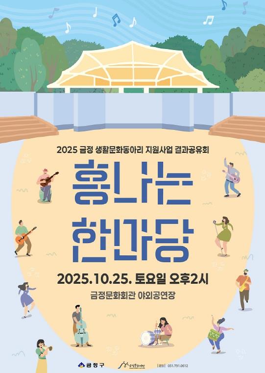 [파이낸셜경제=박영진 기자] 부산시 금정구 금정문화재단은 금정생활문화동아리 지원사업 '흥나는 금정'의 결과 공유회 “흥나는 한마당”프로그램을 오는 10월 25일 오후 2시부터 오후 4시까지 금정문화회관 야외공연장에서 개최한다고 밝혔다.