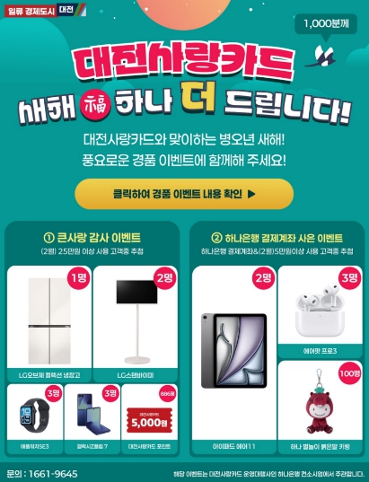 2월 한 달간 대전사랑카드를 25만 원 이상 사용한 고객 중 895명을 추첨해 1등 냉장고, 2등 스탠드형 TV 등 다양한 경품을 제공한다.