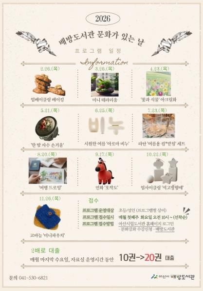 [파이낸셜경제=김영란 기자] 배방도서관은 2월부터 11월까지 매달 하루를 지정해 ‘도서관 문화가 있는 날’ 프로그램을 운영할 계획이다.