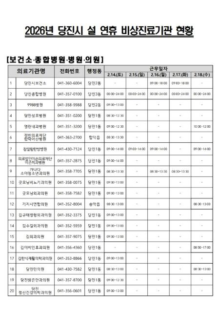 박윤희 당진시보건소장은 “설 연휴 동안 의료 공백 없이 시민들이 안전하고 건강한 명절을 보낼 수 있도록 비상진료 대응에 최선을 다하고 있다”며, “비상 상황 발생 시 운영 중인 의료기관 정보를 미리 확인하고, 응급 상황에는 지체없이 응급의료기관을 방문해달라”고 당부했다.