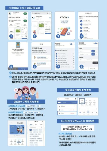아산페이는 ‘지역상품권 CHAK’ 앱에서 ‘아산’을 선택해 충전한 뒤, 가맹점에서 결제하면 이용할 수 있다. 특히, 모바일 아산페이는 14세 이상 전국민 누구나 사용 가능하며, CHAK 앱 설치부터 충전, 결제까지 약 5분 이내로 간편하게 이용할 수 있다.