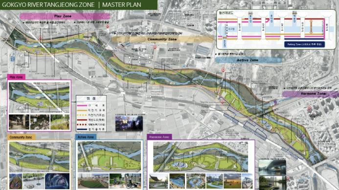 하천을 단순한 치수 중심에서 벗어나 시민의 여가와 생활 체육, 자연 생태가 어우러진 복합 문화 공간으로 확장하기 위해 대상지를 네 가지 주제(테마)로 구성했다. 각 공간은 ▲놀이공간(Play Zone) ▲소통공간(Community Zone) ▲활동공간(Active Zone) ▲화합공간(Harmony Zone)으로 구분된다.