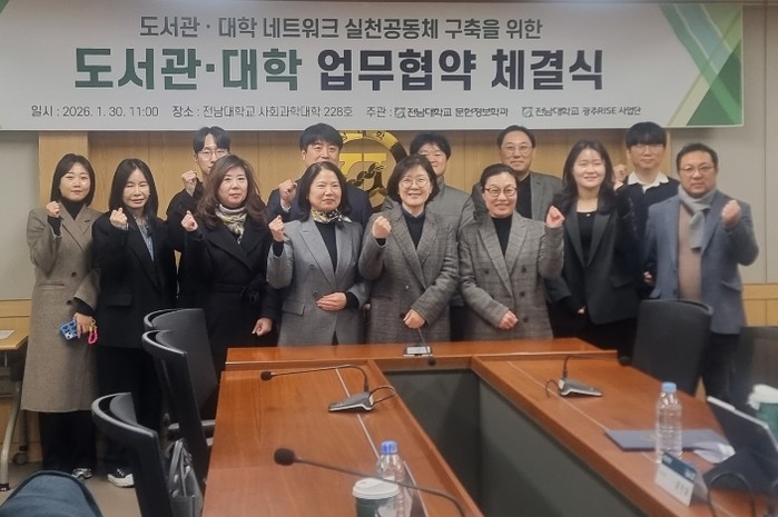 17일 전남대에 따르면 전남대학교 사회과학대학 문헌정보학과는 지난 1월 30일 사회과학대학 228호 회의실에서 광주전남지역대학도서관협의회, 광주광역시교육청중앙도서관, 광주광역시립무등도서관, 광주연구원 AI정책연구센터, 국립아시아문화전당재단 어린이사업본부와 ‘도서관-대학 네트워크 협의체’ 구축을 위한 업무협약을 체결했다.