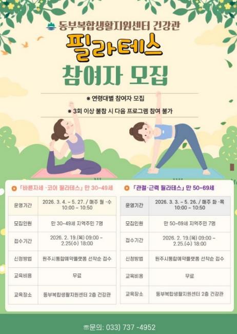 [파이낸셜경제=조성환 기자] 원주시 동부복합생활지원센터 건강관은 오는 19일부터 중·장년을 대상으로 한 필라테스 프로그램 참여자를 모집한다.