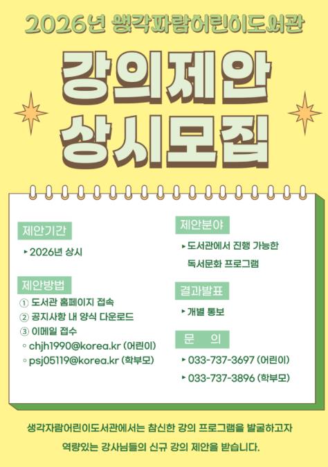제안 분야는 생각자람어린이도서관에서 진행할 수 있는 독서문화 프로그램으로, 주 대상은 유아, 어린이, 학부모다.