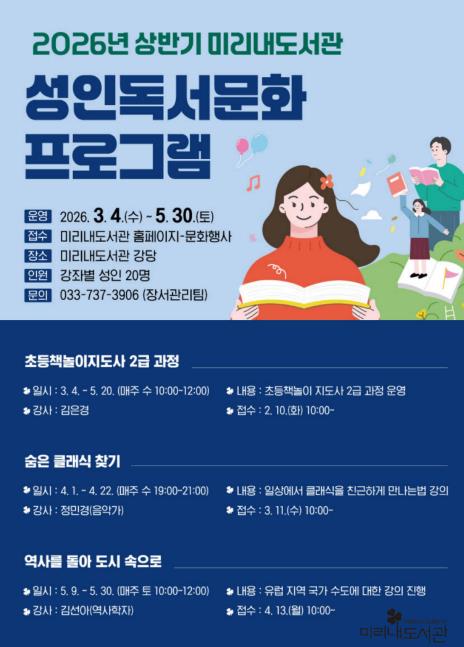[파이낸셜경제=조성환 기자] 원주시 미리내도서관은 시민들의 문화 접근성을 높이기 위해 성인을 대상으로 상반기 독서문화 프로그램을 운영한다.