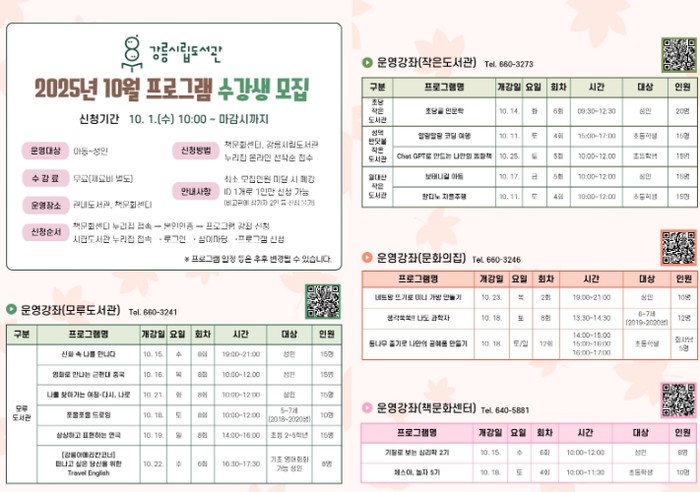 [파이낸셜경제=조성환 기자] 강릉시립도서관은 오는 10월 1일부터 '2025년 10월 프로그램'에 참여할 수강생을 모집한다.