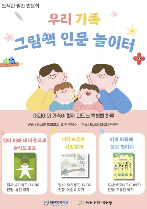 [파이낸셜경제=김기보 기자] 제천기적의도서관은 오는 4월부터 6월까지 총 3회차로 구성된 가족 인문 프로그램 ‘우리 가족 그림책 인문 놀이터’를 운영한다.