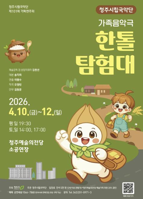 [파이낸셜경제=김기보 기자] 청주시립국악단은 4월 10일부터 12일까지 3일간 청주예술의전당 소공연장에서 제101회 기획연주회 가족 음악극 ‘한톨탐험대’를 개최한다고 19일 밝혔다.