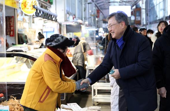 | ▲ 장인홍 구로구청장이 지난달 30일 설을 앞두고 관내 전통시장을 방문해 시장 상인들과 인사를 나누며 애로사항 등을 듣고 있다. |