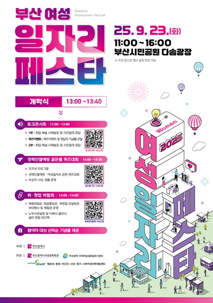 [파이낸셜경제=박영진 기자] 부산시는 오는 9월 23일 오전 11시부터 오후 4시까지 부산시민공원 다솜마당에서 '2025 부산 여성 일자리 페스타'를 개최한다고 밝혔다.