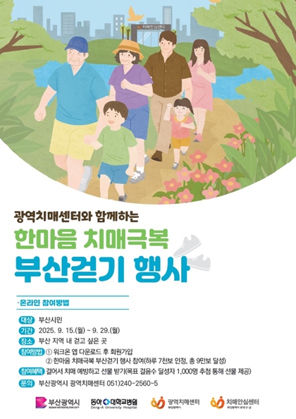 또한, 오늘(15일)부터 29일까지 주간행사로 워크온 앱을 활용한 비대면 '한마음 치매극복 부산걷기 행사'와 온라인 이벤트 등 다양한 참여 프로그램이 진행된다. 이를 통해 시민들에게 치매 관리의 중요성을 널리 알리고 치매 극복을 위한 사회적 공감대를 형성할 계획이다.