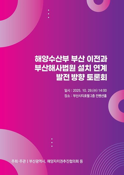 [파이낸셜경제=박영진 기자] 부산시는 오늘(29일) 오후 2시, 부산시티호텔 2층 컨벤션홀에서 '해양수산부 부산 이전과 부산해사법원 설치 연계 발전 방향 토론회'를 개최한다고 밝혔다.