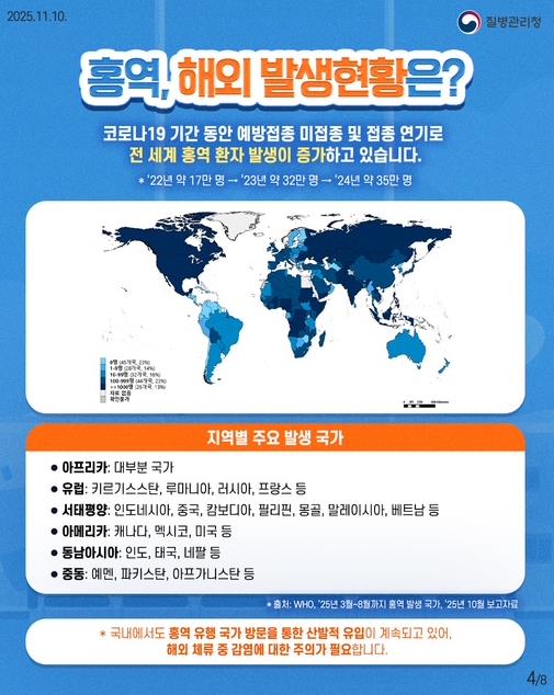 보건소 관계자는 “해외여행 전 홍역 예방백신 2회 접종 여부를 반드시 확인해야 하며, 접종 기록이 없거나 불확실한 경우 출국 최소 4주 전 의료기관을 방문해 4주 간격으로 2회 접종할 것을 권고한다”고 말했다.