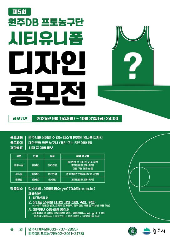 심사를 거쳐 선정된 최우수상·우수상·장려상 각 1명(팀)에는 300·100·50만 원의 상금이 수여된다. 특히 최우수상 수상작은 실물로 제작돼 원주DB 프로농구단 선수들이 2025-2026 시즌 홈·원정 각 1경기씩 실착할 예정이다.