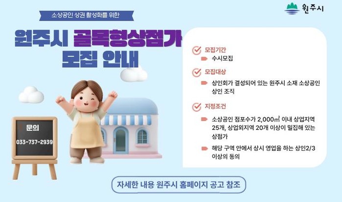 한편 원주시에서는 이달에만 5곳이 신규 지정되며 현재 총 12개 상권이 골목형상점가로 운영되고 있다. 해당 구역 내 점포 수는 모두 1,047곳에 달한다.