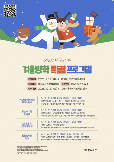 [파이낸셜경제=조성환 기자] 원주시 태장도서관은 겨울방학을 맞아 1월 12일부터 2월 12일까지 겨울방학 특별 프로그램을 운영한다.