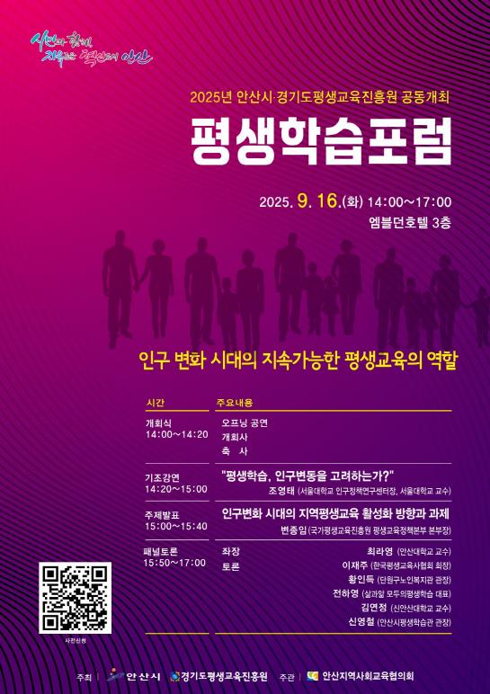 이후 최라영 안산대학교 교수를 좌장으로, 이재주 한국평생교육사협회 회장, 황인득 단원구노인복지관 관장, 전하영 삶과알 모두의 평생학습 대표, 김연정 신안산대학교 교수, 신영철 안산시평생학습관 관장이 참여한 패널토론이 이어졌다. 토론에서는 인구변화에 대응하는 평생교육의 정책적·실천적 대안이 활발히 논의됐다.