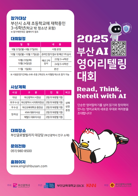 [파이낸셜경제=박영진 기자] 부산시는 인공지능(AI)과 리텔링(Retelling)을 결합한 차별화된 영어 말하기 대회인'2025 부산 인공지능(AI) 영어 리텔링 대회'를 개최한다고 밝혔다.
