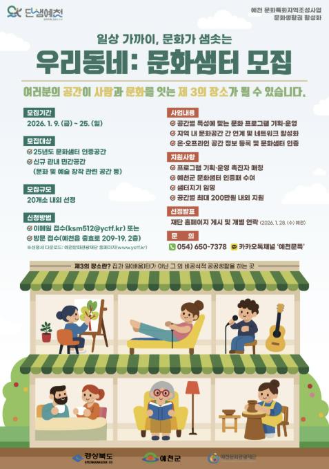 [파이낸셜경제=김지훈 기자] 예천군과 (재)예천문화관광재단은 ‘문화특화지역 조성사업’의 일환으로 문화생활권 조성을 위한 ‘우리동네:문화샘터’ 2기 참여자를 9일부터 25일까지 모집한다.