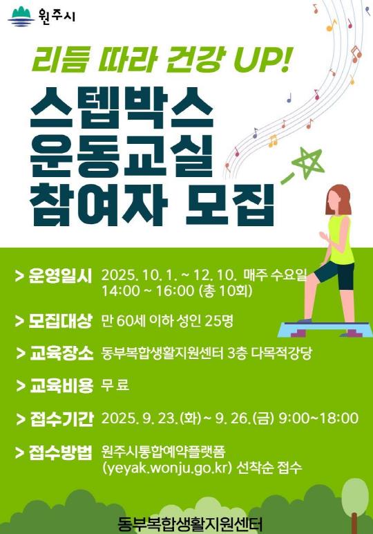 [파이낸셜경제=조성환 기자] 원주시동부복합생활지원센터는 오는 23일부터 26일까지 ‘리듬 따라 건강 업(UP)! 스텝박스 운동교실’ 참여자를 모집한다.