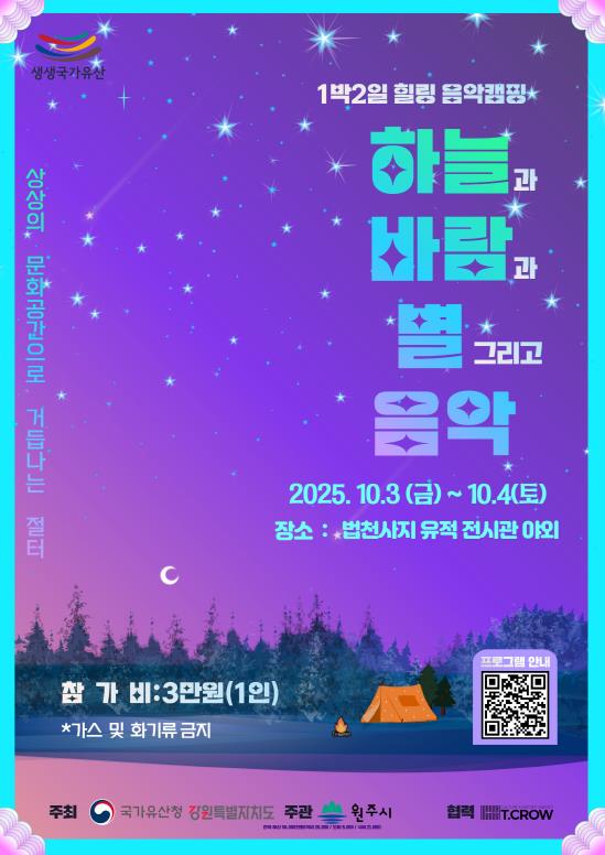 [파이낸셜경제=조성환 기자] 원주시역사박물관은 다음 달 3일과 4일, 부론면 법천사지에서 힐링 음악캠프 ‘법천사지 하늘과 바람과 별 그리고 음악’을 진행한다.